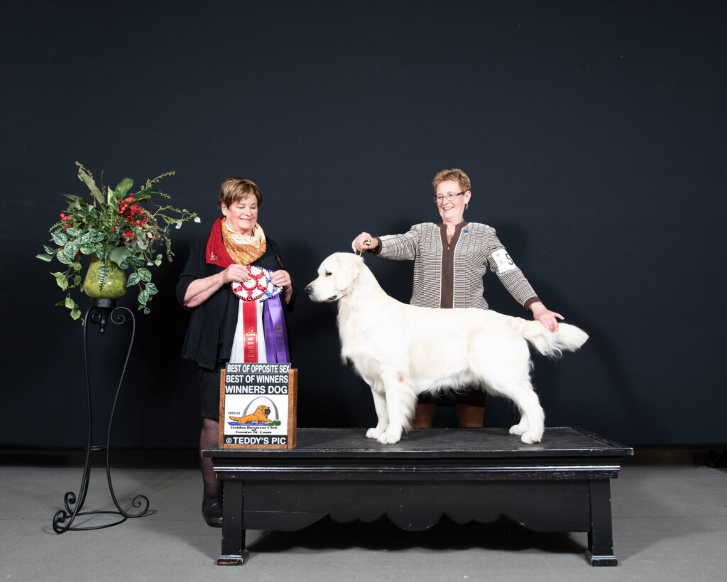 Pierce currently has 10 points, with back to back majors at a specialty under breeder judges. He moves effortlessly, with a lot of reach and drive. He has natural retrieving ability and will retriever bumpers for hours. Prior to coming to the US, Pierce earned his Champion title in Australia.