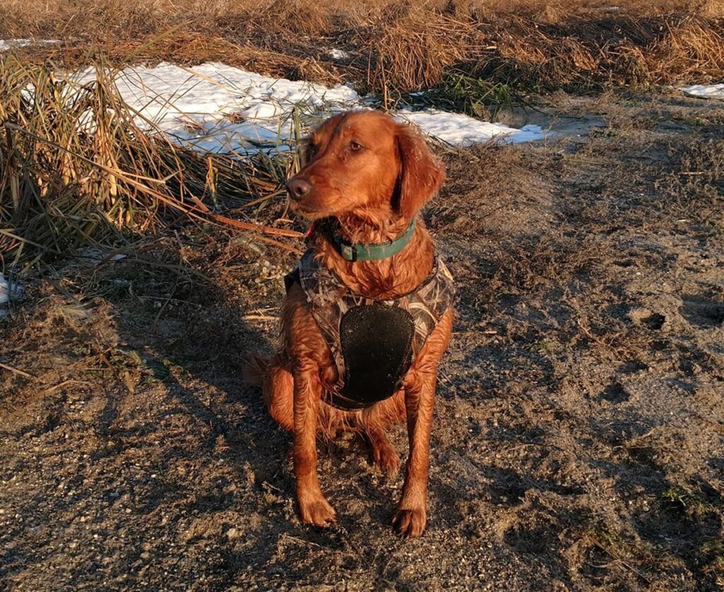 Reba is a dark red Golden with a sweet disposition. She has petite features and is great in the field and around the house.
